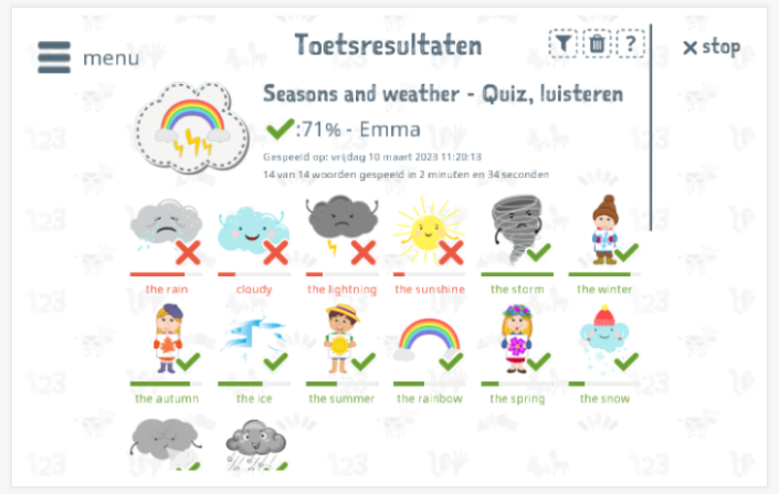 Toetsresultaten blijven gedurende enkele weken beschikbaar op het apparaat. Hierdoor krijgen ouders en begeleiders inzicht in de verbetering van de woordenschatkennis over het verloop van de tijd.