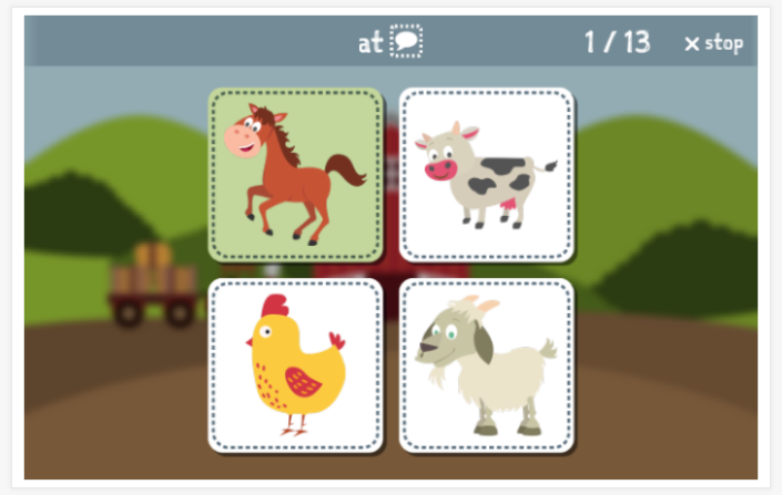 Als een plaatje in het juiste vak is gesleept, wordt het bijbehorende woord (met lidwoord) uitgesproken. Nadat er 4 plaatjes geplaatst zijn, hoort het kind een applaus. Vervolgens worden de plaatjes een voor een uitgelicht en wordt het bijbehorende woord opnieuw uitgesproken.