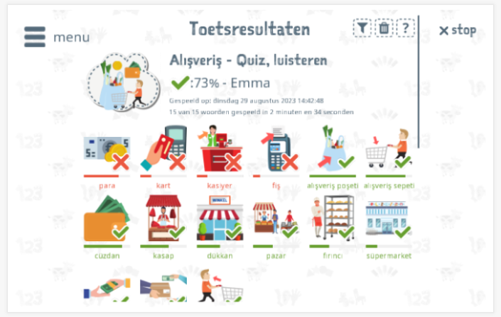 Toetsresultaten blijven gedurende enkele weken beschikbaar op het apparaat. Hierdoor krijgen ouders en begeleiders inzicht in de verbetering van de woordenschatkennis over het verloop van de tijd.